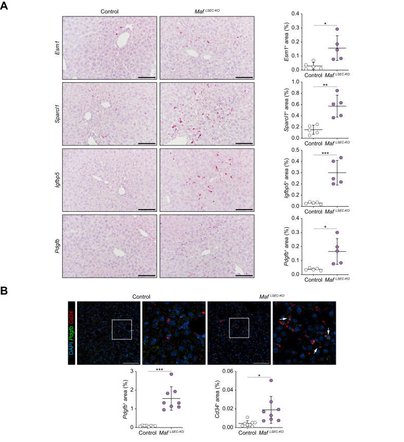 Methods: Clec4g-iCre/Maf fl/fl (Maf LSEC-KO ) mice with LSEC-specific Maf deficiency were generated and liver tissue was analyzed histologically. LSECs were isolated for bulk RNA-seq, ATAC-seq, and single-cell (sc) RNA-seq analysis. Maf LSEC-KO livers were analyzed after MASH diet feeding. The expression of MAF and its targets was analyzed in published human scRNA-seq data.