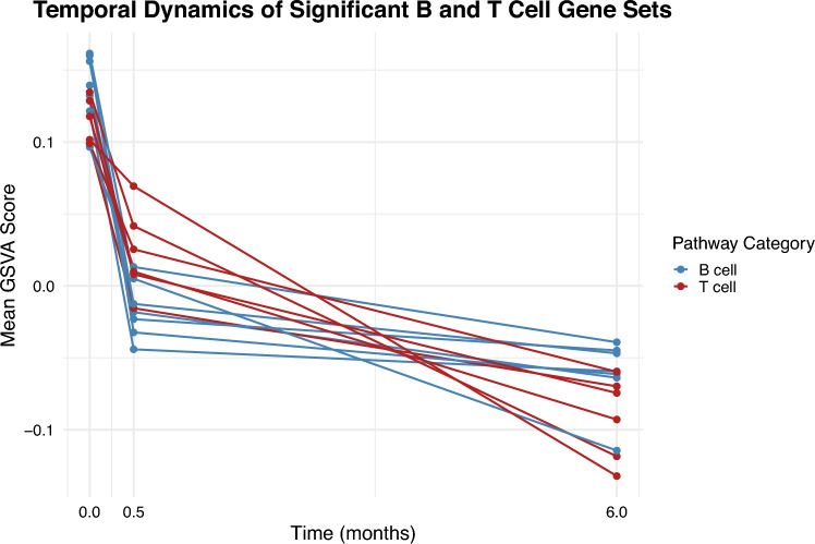 Results: Early effects were characterized by selective suppression of B cell-related pathways, including antigen presentation via MHC-II, B cell proliferation, and survival. These changes were accompanied by compensatory upregulation of anti-inflammatory and innate immune signaling (e.g., IL-10, monocyte chemotaxis). At 6 months, B cell pathway suppression persisted and deepened, while T cell-specific pathways (e.g., CD4+ T-cell activation and cytokine production) showed significant downregulation, indicating a delayed but substantial impact on adaptive cellular immunity. At 6 months, T reg compartment was reconfigured, with overall T reg transcription enhanced versus T effector cells, quiescent and thymic‑mature signatures reduced, and IL‑4-induced T reg program enriched.