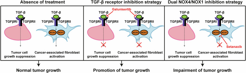 Transforming growth factor beta (TGF-β) signalling has become an attractive therapeutic target due to its pro-tumorigenic actions on epithelial cells and its immunosuppressive effects in the tumour microenvironment. In intrahepatic cholangiocarcinoma (iCCA), a highly aggressive malignancy of the biliary tract with poor prognosis, the latest clinical trials using TGF-β inhibitors have failed indicating that the specific actions carried out by TGF-β in iCCA are yet not well delineated. Here, we show that TGF-β signalling is highly active in iCCA and exerts a prominent suppressor effect on tumour cell lines and organoids established from iCCA metastases biopsies, that relies on a functional canonical SMAD2/3/4 signalling. Thus, TGF-β inhibitors promote, instead of inhibiting, tumour cell growth. In this context, a promising strategy is to target intracellular proteins downstream the TGF-β receptors accounting only for TGF-β pro-tumorigenic actions. NADPH oxidase 4 (NOX4), a downstream mediator of the TGF-β signalling pathway, is strictly expressed in cancer-associated fibroblasts (CAF) of iCCA and acts in concert with NOX1 to regulate CAF functions. Use of a dual NOX4/NOX1 inhibitor impaired CAF actions and reduced tumour growth in vitro and in two different in vivo iCCA experimental models. Collectively, our findings reveal an actionable way to specifically target TGF-β pro-tumorigenic actions in CAF from iCCA without undesirable side effects on tumour cells, suggesting a potentially bright future for dual NOX4/NOX1 inhibitors in the clinics, alone or in combination with other therapies.