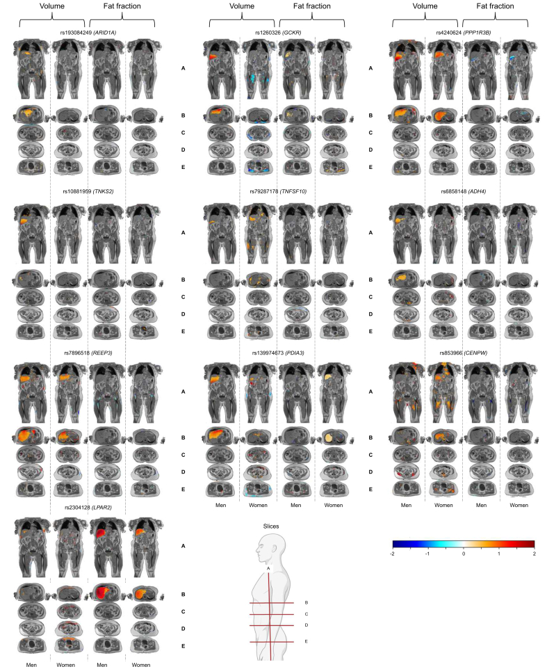 Impact of genetic variants linked to liver fat and liver volume on MRI-mapped body composition