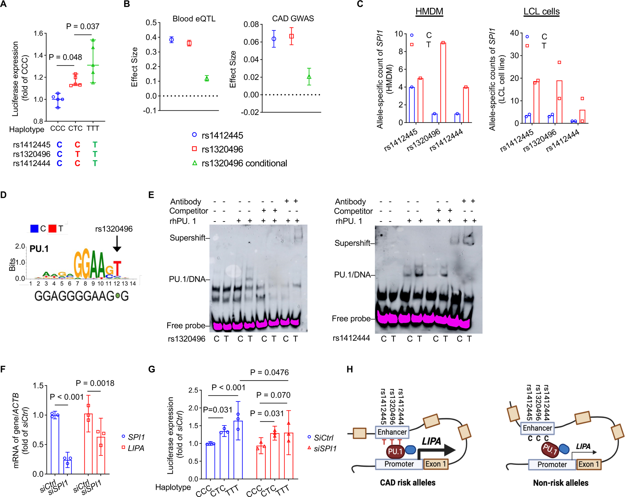 Methods: Post-genome-wide association study pipelines and molecular biology techniques, including expression quantitative trait loci analysis, Tri-HiC, luciferase assay, CRISPRi, allele-specific binding, motif analysis, and electrophoretic mobility shift assay, were used to link functional variants to target genes and define the direction of their regulatory effects in causal cell types. To determine how increased myeloid LIPA impacts atherosclerosis, myeloid-specific Lipa overexpression mice on an Ldlr-/- background were generated.