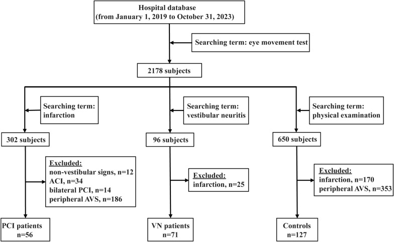 Methods: A total of 56 patients with AVS due to PCI free of non-vestibular signs, 71 patients with AVS due to VN, and 127 controls were selected retrospectively into the study from our hospital database. Demographic, clinical data, and videooculography results were extracted.