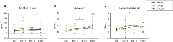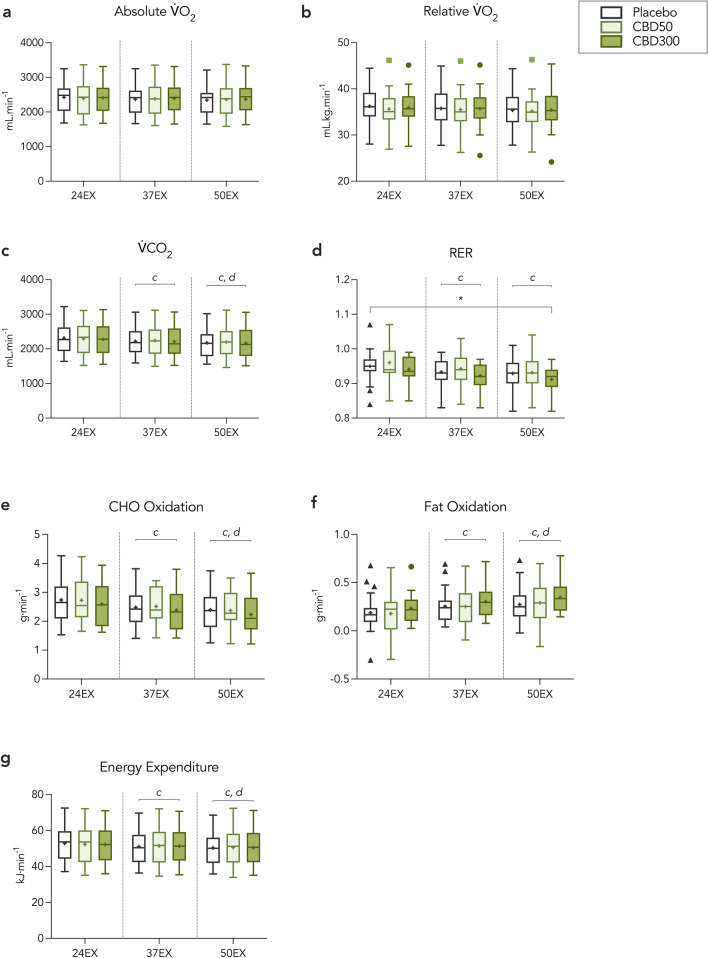 Results: A randomised double-blind, placebo-controlled, crossover clinical trial was conducted at the University of Sydney between 24th October 2022 and 4th March 2024. Twenty-five participants (16 male; O2max = 53.1 ± 7.5 mL·min kg-1) received either 0 (placebo), 50 or 300 mg CBD 1.5 h prior to completing a 60-min, submaximal intensity (~ 70% O2max) treadmill run (RUN 1), followed by an incremental run to volitional exhaustion (RUN 2). Neither dose of CBD altered subjective responses (i.e., affective valence, enjoyment, perceived exertion, pain) during RUN 1, nor enjoyment, mood or anxiety following RUN 1 and 2 (p's > 0.05). CBD also had a limited effect on exercise physiology and performance, with heart rate, exercise efficiency (i.e., O2), O2peak and time to exhaustion (TTE) unchanged relative to placebo (p's > 0.05). However, 300 mg CBD decreased the respiratory exchange ratio during RUN 1 (p = 0.030) and 50 mg CBD increased blood glucose upon cessation of RUN 2 (p = 0.003), compared to placebo. There was no effect of either dose on plasma concentrations of muscle damage markers, creatine and myoglobin (p's > 0.05), but a Treatment x Time x Sex interaction was identified for the gastrointestinal barrier function marker, lipopolysaccharide, with post hoc analyses revealing higher concentrations in females Post RUN 2 on 50 mg (p = 0.032), but not 300mg CBD (p = 1.000), compared to placebo.