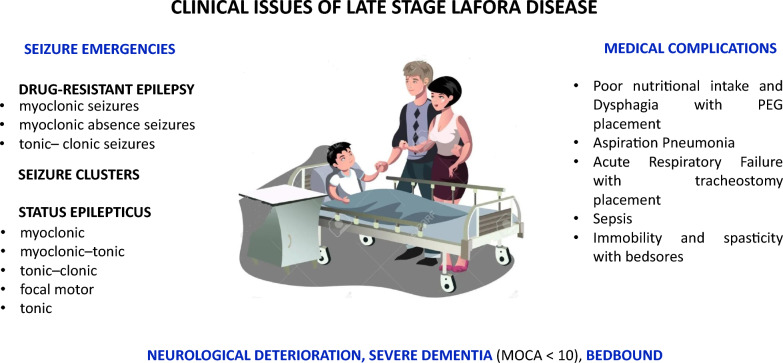 Keywords: Electroclinical features; Lafora disease; Late stage; Management; Medical complications; Status epilepticus.