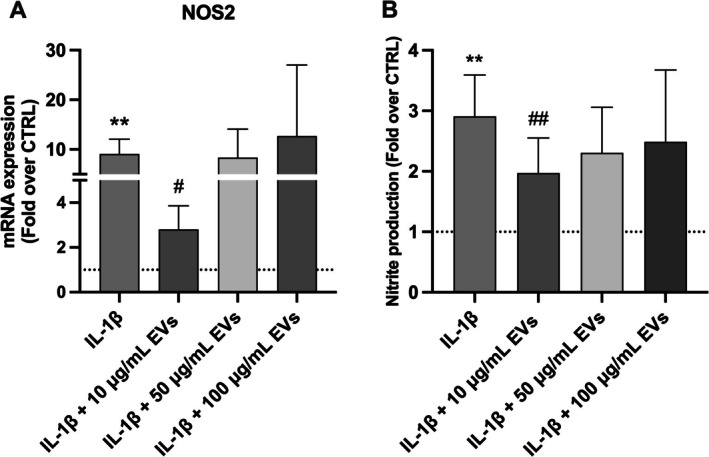 Methods: Following isolation, hNPCs (n = 10) were encapsulated in alginate beads and treated with 10, 50, and 100 μg/mL of WJ‐MSC‐EVs after preincubation with 10 ng/mL interleukin (IL)‐1β. Cell proliferation, viability, nitrite production, and glycosaminoglycan (GAG) content were assessed. Histological analyses evaluated extracellular matrix (ECM) production. Phenotypic (SOX9, KRT19), catabolic (MMP1, MMP13, ADAMTS5, IL6, NOS2), and anabolic (ACAN) ECM markers were analyzed by RT‐qPCR.