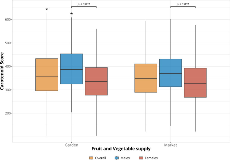 Results: Participants had a mean BMI of 23.30 ± 3.79, which falls within the normal range as well as a medium adherence to the dietary (MEDAS: 7.19 ± 1.86) and lifestyle (MEDLIFE: 3.38 ± 1.21) MD patterns. Mean skin carotenoid levels were 360.61 ± 97.02, with higher carotenoid score in participants stocking up on FV from garden than market (368.28 ± 99.98 vs 357.84 ± 95.88, p = 0.03). Moreover, skin carotenoids were significantly higher in participants declaring to consume more than 2 servings of vegetables and more than 3 servings of fruits/day compared to those having less FV intakes (391.67 ± 101.03 vs 349.27 ± 90.92, p < 0.0001). Multiple regression analyses have revealed that the carotenoid score was positively associated with age, male gender, MEDAS, stocking up on FV from the garden and consuming high FV, while it was negatively associated with BMI and smoking habits.
