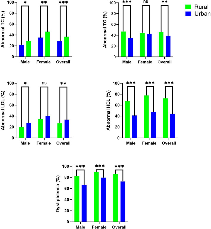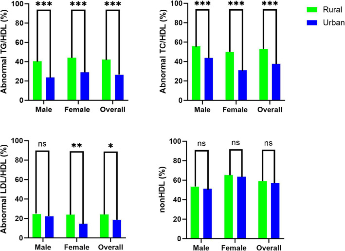 Results: The prevalence of high total cholesterol (TC), and low-density lipoprotein cholesterol (LDL-c) was significantly greater in the urban than rural population (TC: 37.0% vs. 28.4% p < 0.001 and LDL-c: 33.5% vs. 26.8%, p < 0.01, respectively), while the prevalence of low high-density lipoprotein cholesterol (HDL-c: 72.4% vs. 44.2%, p <0.001), high triglycerides (TG: 45.7% vs. 38.6%, p <0.01) and lipid risk ratios (TC/HDL-c, TG/HDL-c and LDL-c/HDL-c) was higher in the rural than urban population. Females in both urban and rural populations were at a higher risk of having multiple lipid abnormalities. For the other risk factors assessed, while diabetes, overweight, obesity, and physical inactivity were associated with increased risks for certain lipid abnormalities, these associations were less pronounced in the urban population.