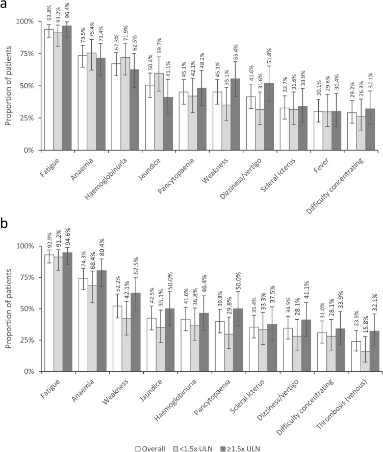 Results: Out of 113 patients, 49.5% had LDH levels ≥1.5 ULN (high-LDH), these had greater physician-perceived disease severity (p<0.001). Anticoagulation treatments (39.8%), prednisone (31.0%), and cyclosporine (27.4%) were most prescribed. More high-LDH patients received rivaroxaban (p=0.002) or vitamin B12 supplements (p=0.008). Overall, the most common symptoms were fatigue and anaemia (92.9% and 74.3%, respectively). Haemolytic crises were reported for 39.3% of all patients, thrombotic events were more common in high-LDH patients (50.0%, compared with 23.2%, p=0.006). Patients reported moderate fatigue levels in the FACIT-Fatigue scale.