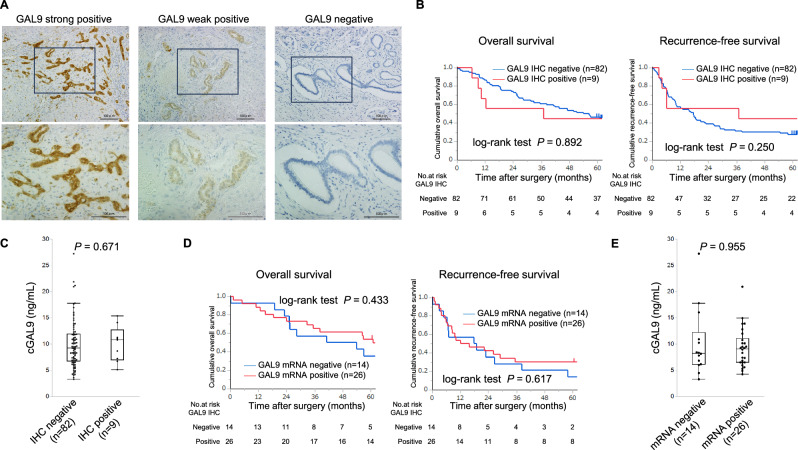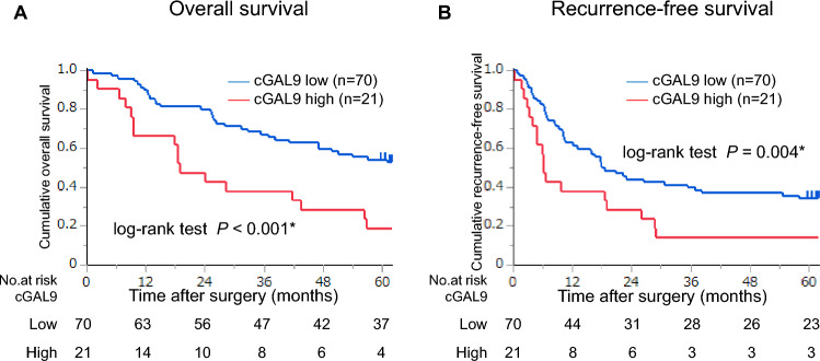 Results: The optimal cGAL9 cutoff was 12.0 ng/ml using minimum P value approach. Higher cGAL9 levels linked to multiple tumors (P = 0.046), poorer overall survival (OS), and recurrence-free survival (RFS). Tumor cell GAL9 expression by IHC did not correlate with OS or RFS. cGAL9 levels did not correlate with tumor cell expression in IHC analyses or GAL9 mRNA in resected specimens. However, cGAL9 levels correlated with mRNA levels of glycolysis markers (glucose transporter 1 and hypoxia inducible factor 1 alpha).