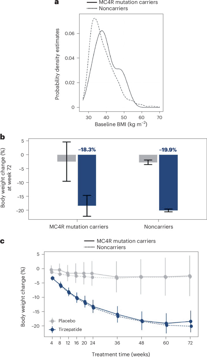 The magnitude of weight reduction in the SURMOUNT-1 trial of the dual GLP-1 and GIP receptor agonist tirzepatide suggests that this treatment may be particularly effective in addressing the treatment needs of people with severe obesity (body mass index >40 kg m-2), some of whom may carry rare penetrant genetic variants. Here we investigated the clinical response of men and women in the SURMOUNT-1 trial who carried pathogenic mutations in the melanocortin 4 receptor (MC4R) gene, the most common genetic cause of obesity. We found that 32 of 2,291 people (1.4%) for whom data were available carried pathogenic MC4R mutations. At baseline, MC4R mutation carriers exhibited a higher body mass index compared with noncarriers (40 kg m-2 versus 38 kg m-2; P = 0.036). In the treatment arm, the weight loss trajectory over 72 weeks was comparable in both groups: 18.3% weight reduction in MC4R mutation carriers versus 19.9% in noncarriers. We conclude that tirzepatide is an effective treatment for the most common genetic subtype of obesity, MC4R deficiency.