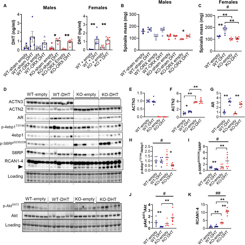 Androgens act through androgen receptor (AR) to maintain muscle mass. Evidence suggests that this pathway is influenced by "the gene for speed," ACTN3 (α-actinin-3). Given that one in five people lack α-actinin-3, it is possible that they may respond to androgens differently. Here, we show that α-actinin-3 deficiency decreases AR in muscles of mice and humans (in males and females) and that AR positively correlates with α-actinin-3 expression in a dosage-dependent manner. α-Actinin-3 deficiency exacerbates gastrocnemius mass loss with androgen deprivation in male mice and stunts the muscle growth response to dihydrotestosterone in female mice at the onset of puberty. This is mediated by differential activation of pathways regulating amino acid metabolism, intracellular transport, autophagy, mitochondrial activity, MAPK, and calcineurin signaling, likely driven by seven key genes that are both androgen sensitive and α-actinin-3-dependent in expression. Our results highlight a role for ACTN3 as a regulator of muscle mass and a genetic modifier of androgen action in skeletal muscle.