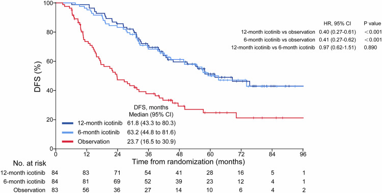 The efficacy, safety and ideal treatment duration of an adjuvant epidermal growth factor receptor tyrosine kinase inhibitor (EGFR-TKI) for patients with resected EGFR-mutated non-small-cell lung cancer (NSCLC) were not known until 2014, when this study was initiated. In this phase 3 ICTAN trial (GASTO1002, NCT01996098), patients with completely resected, EGFR-mutated, stage II-IIIA NSCLC after adjuvant chemotherapy were assigned in a 1:1:1 ratio to receive icotinib (125 mg, three times daily) for 12 months, to receive icotinib for 6 months, or to undergo observation. The primary endpoint was disease-free survival (DFS). This trial was terminated early. A total of 251 patients were randomized. Adjuvant icotinib for 12 months significantly improved DFS (hazard ratio [HR]: 0.40, 95% confidence interval [CI], 0.27-0.61; P < 0.001) and overall survival (OS; HR: 0.55, 95% CI, 0.32-0.96; P = 0.032) compared with observation. Adjuvant icotinib of 6 months also significantly improved DFS (HR: 0.41, 95% CI, 0.27-0.62; P < 0.001) and OS (HR: 0.56, 95% CI, 0.32-0.98; P = 0.038) compared with observation. Adjuvant icotinib for 12 months did not improve DFS (HR: 0.97; P = 0.89) or OS (HR: 1.00; P = 0.99) compared with 6 months of this drug. Rates of adverse events of grade 3 or higher were 8.3%, 6.0% and 2.4% for the 12-month icotinib, 6-month icotinib, and observation groups, respectively. Adjuvant icotinib for 12 months or 6 months following adjuvant chemotherapy improved DFS and OS compared with observation in patients with resected EGFR-mutated stage II-IIIA NSCLC with a manageable safety profile, supporting it as a potential treatment option.