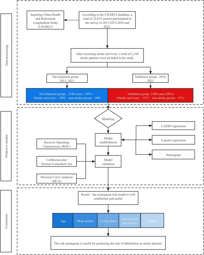 Methods: Data were extracted from the CHARLS database. Stroke survivors were identified and assessed across 30 indicators, including socio-demographic, physical, psychological, cognitive, and social variables. The data were divided by year, with 2013 and 2015 as the development set and 2018 and 2020 as the validation set. Least Absolute Shrinkage and Selection Operator (LASSO) regression was employed for variable selection. Logistic regression models were then developed based on univariate and LASSO-selected predictors. A nomogram was constructed to facilitate risk visualization. Calibration curves and decision curve analysis were used to evaluate model calibration and clinical utility.