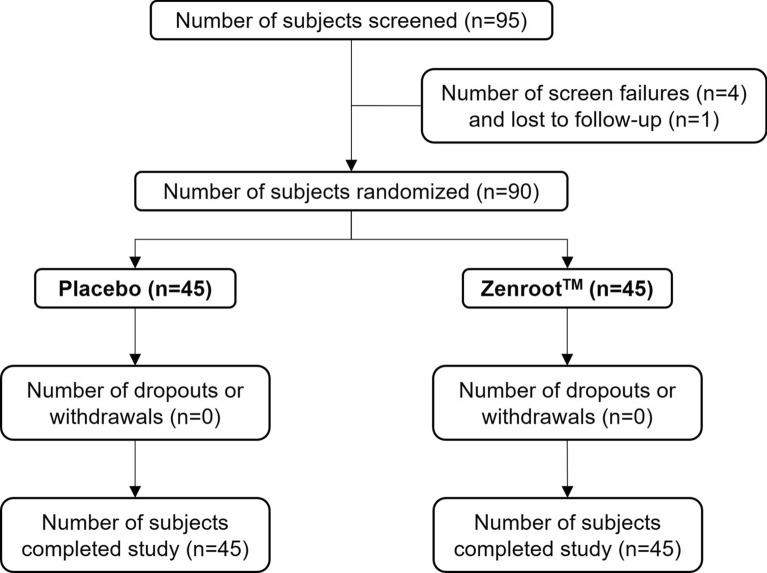 Methods: This was a prospective, randomized, double-blind, parallel, placebo-controlled, clinical interventional study with supplementation duration of 84 days. Ninety subjects were randomly assigned in a 1:1 ratio to receive 125 mg of ZEN or placebo. We measured stress using the Perceived Stress Scale (PSS) score as a primary endpoint. Various secondary endpoints included Mindfield eSense Skin Response (SCR) and Mindfield eSense PULSE Heart Rate Variability (HRV)-Root Mean Square of Successive Differences (RMSSD), and standard deviation of normal NN interval (SDNN), Beck Anxiety Inventory (BAI), Profile of Mood States (POMS), Pittsburgh Sleep Quality Index (PSQI), stress biomarkers of serum cortisol, and salivary alpha amylase (sAA) levels and safety parameters. The study assessments were performed on days 0, 14, 28, 56, and 84.