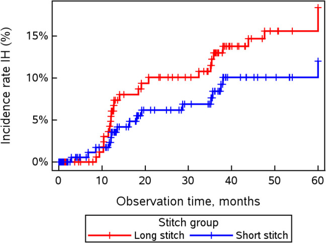 Results: In total, 362 patients were included in the 5-year ITT analysis (175 and 187 patients in the short-bite and large-bite groups, respectively). The incisional hernia rate increased in the short-bite group from 7.58% to 9.14% (p = 0.58) and in the large-bite group from 10.45% to 13.90% (p = 0.30) after 5 years compared to 3 years postoperatively. The incisional hernia rate in the short-stitch group was low, at 9.14% five years after surgery; however, the difference between the two treatment groups (short vs. long) was not significant at 5 years (OR 1.60, 95% CI [0.82-3.10]; p = 0.155).