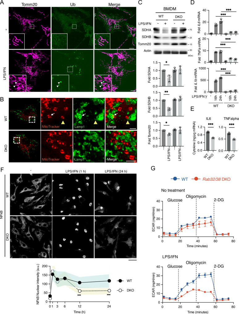 Microautophagy is an intracellular degradation process in which degradatory organelles, such as the lysosome, directly take up substrates by invagination and/or protrusion of their membranes. Here, we provide evidence that Rab32-positive, lysosome-related organelles in macrophages incorporate various other organelles, including endosomes and mitochondria. Our data indicates that, upon exposure to a mitochondria-damaging reagent, mitochondria can be directly engulfed by the lysosome-like organelles independently of macroautophagy or ESCRT machinery. Rab32 GTPase, phosphatidylinositol 3,5-bisphosphates, ubiquitination, and p62/SQSTM1 are crucial for this degradation. Furthermore, the degree of M1 polarization of macrophages, which is facilitated by metabolic reprogramming into increased glycolysis via mitochondrial elimination, is significantly reduced in Rab32/38 double-knockout macrophages. Thus, microautophagy plays a role in the physiological regulation of macrophages.