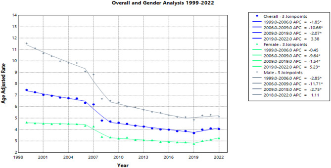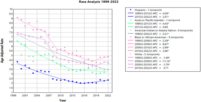 Methods: CDC WONDER was used to identify influenza- and pneumonia-related deaths in lung cancer patients that occurred within the United States from 1999 to 2022. Crude and age-adjusted mortality rates (AAMR) were calculated, as well as annual percent change and weighted average annual percent change with 95% confidence intervals for the AAMRs. The Joinpoint Regression Program was used to determine trends in mortality within the study period.