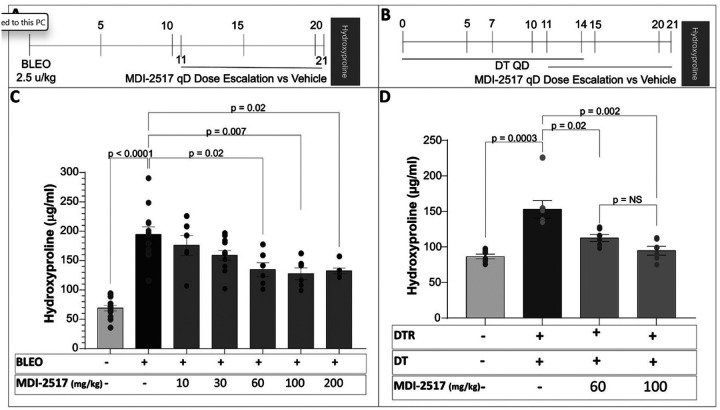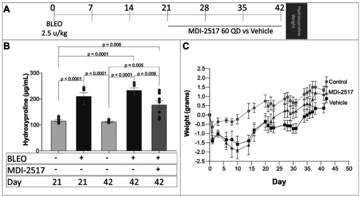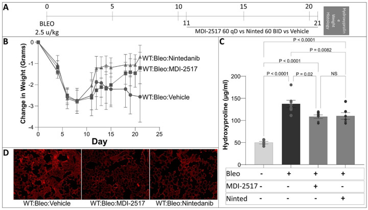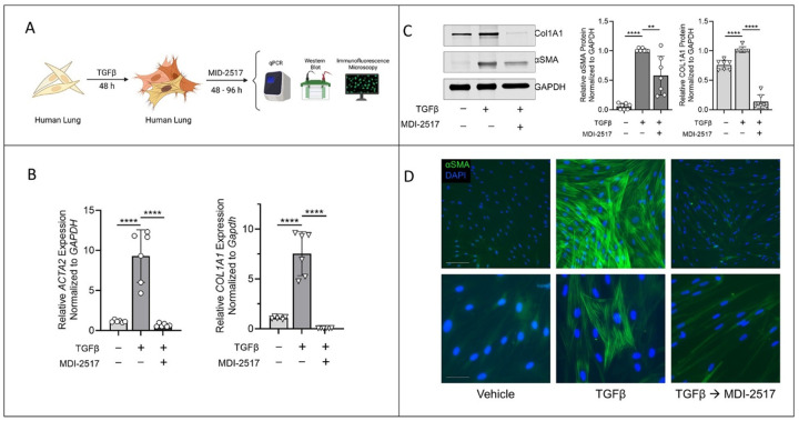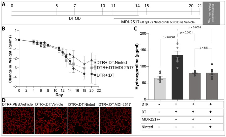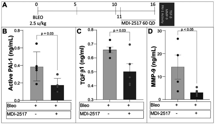 Fibrotic lung diseases are associated with significant morbidity and mortality, and few therapies have been FDA-approved for patients with these conditions. Therefore, developing effective anti-fibrotic treatments represents an unmet clinical need. Plasminogen activator inhibitor 1 (PAI-1) is an attractive therapeutic target as its expression is up-regulated in the context of fibrotic lung disease, and a causal role for PAI-1 in lung fibrogenesis has been established in complementary animal models. Here, we study the efficacy of a novel small molecule PAI-1 inhibitor, MDI-2517, to attenuate lung fibrosis. We observed that MDI-2517 administered during the fibrotic phase of complementary murine models reduces the severity of scarring. Furthermore, we found that MDI-2517 treatment beginning on day 21 after lung injury accelerates fibrosis resolution while in vitro data reveal that this drug reverses myofibroblast differentiation. These results motivate targeting PAI-1 as a therapy for lung fibrosis and highlight MDI-2517 as a promising drug.