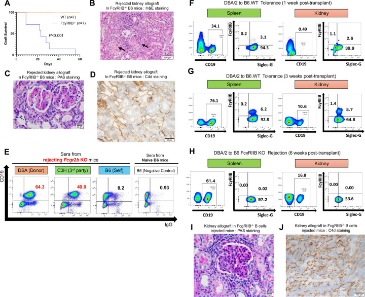 We previously showed that infiltrating cytotoxic immune cells are reprogrammed to regulatory-like/exhausted cells within accepted kidney allografts through a 'defensive tolerance' mechanism. We observed a regulatory B cell (Breg) signature within the accepted kidney. Here we show that despite a Breg phenotype, neither B cell depletion nor the use of μMT recipients which lack B cells, resulted in kidney allograft rejection. Negative regulators of B cell function, Siglecg and Fcgr2b, show increased expression in both accepted kidney and lung allografts. Kidney allografts transplanted in B6.Fcgr2b KO recipients underwent antibody mediated rejection. Hypothesizing that similar mechanisms in a tumor microenvironment may attenuate anti-tumor immunity, we observed that expression of SIGLEC10, the human homolog of Siglecg, was associated with resistance to anti-PD1 therapy in human melanomas. In conclusion, B cell expression of FcγRIIB and Siglec-G appear to play an essential role in maintaining transplant tolerance and in tumor evasion of anti-tumor immunity.