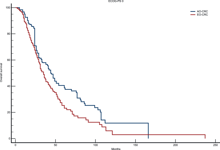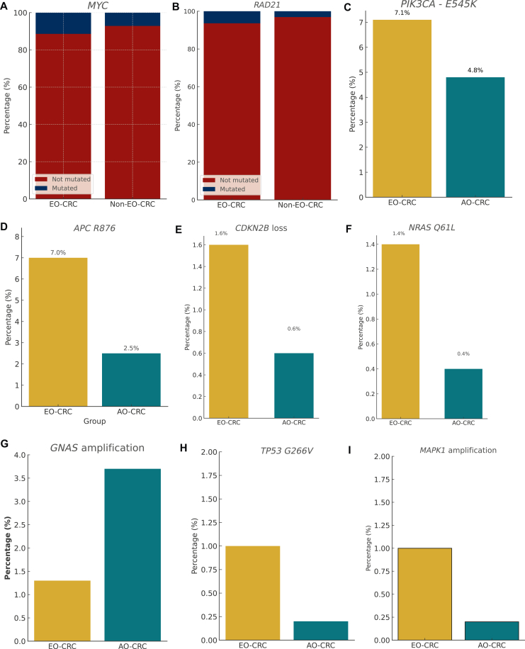 Results: Patients with EO-CRC showed a unique genomic profile marked by a higher incidence of MYC, RAD21, GNAS, and MAPK1 amplifications. They also experienced CDKN2B loss and recurrent mutations, including APC∗, NRAS Q61L, PIK3CA, and TP53 G266V. These variations were statistically significant, indicating different oncogenic pathways. When comparing matched analyses, patients with EO-CRC had notably poorer OS than those with AO-CRC: 35 months versus 41 months in the overall matched group (P = 0.0326), 35 months compared with 44 months among Eastern Cooperative Oncology Group performance status 0 patients (P = 0.0026), and 27 months versus 44 months in the RAS/BRAF-mutated subgroup (P = 0.0024).
