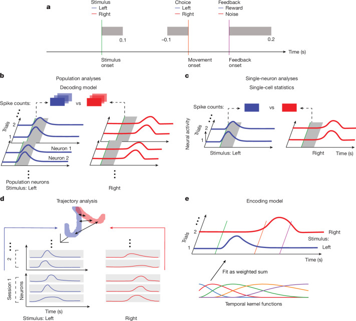 A key challenge in neuroscience is understanding how neurons in hundreds of interconnected brain regions integrate sensory inputs with previous expectations to initiate movements and make decisions1. It is difficult to meet this challenge if different laboratories apply different analyses to different recordings in different regions during different behaviours. Here we report a comprehensive set of recordings from 621,733 neurons recorded with 699 Neuropixels probes across 139 mice in 12 laboratories. The data were obtained from mice performing a decision-making task with sensory, motor and cognitive components. The probes covered 279 brain areas in the left forebrain and midbrain and the right hindbrain and cerebellum. We provide an initial appraisal of this brain-wide map and assess how neural activity encodes key task variables. Representations of visual stimuli transiently appeared in classical visual areas after stimulus onset and then spread to ramp-like activity in a collection of midbrain and hindbrain regions that also encoded choices. Neural responses correlated with impending motor action almost everywhere in the brain. Responses to reward delivery and consumption were also widespread. This publicly available dataset represents a resource for understanding how computations distributed across and within brain areas drive behaviour.