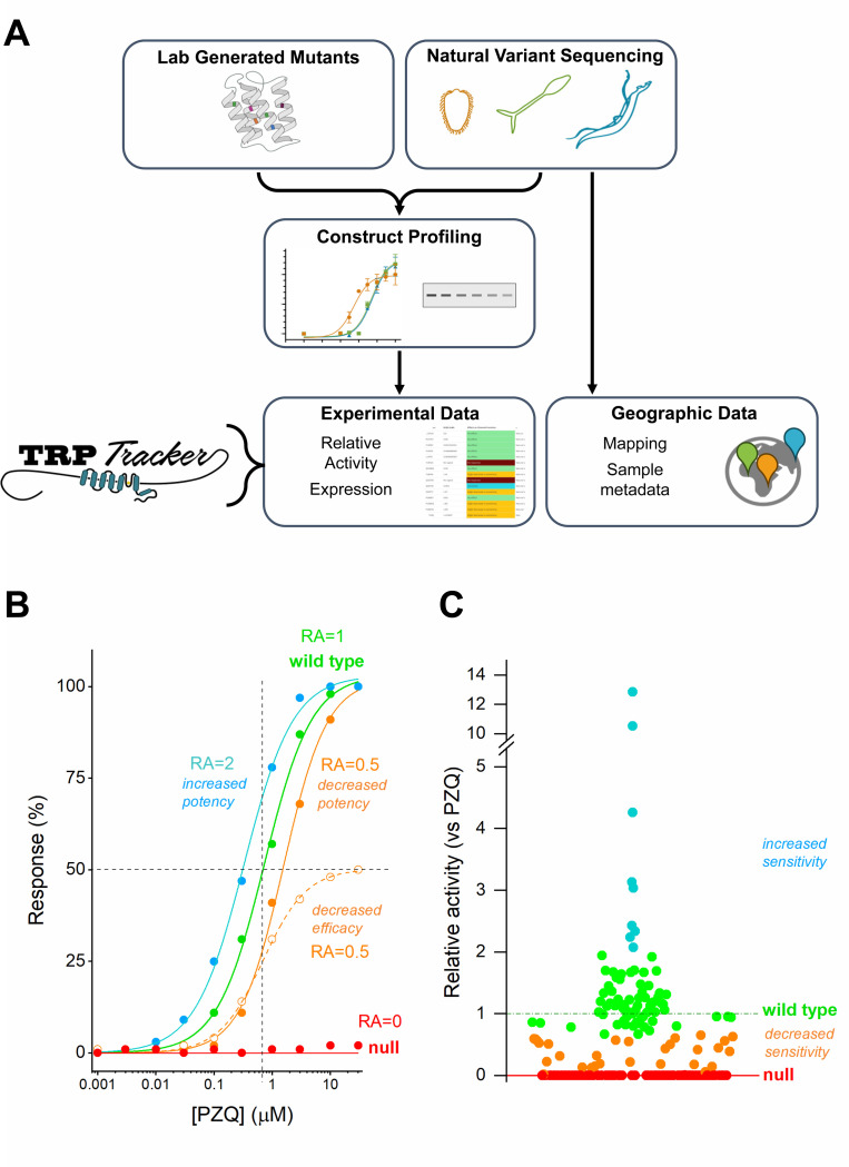The anthelmintic praziquantel (PZQ) has been used for decades as the clinical therapy for schistosomiasis, and remains the only available drug. As a cheap and effective drug therapy for all human disease-causing Schistosoma species, usage of PZQ underpins mass drug administration strategies aimed at eliminating schistosomiasis as a public health problem by 2030. Concern over the potential emergence of resistance to PZQ is therefore warranted, as it would constitute a major threat to this approach. In terms of molecular adaptations conferring PZQ resistance, variation in the sequence and/or expression of the drug target is an obvious mechanism and should be a priority for surveillance efforts. The target of PZQ is a transient receptor potential ion channel, TRPMPZQ, which is established as a locus that regulates schistosome sensitivity to PZQ. Here, we describe the establishment of a community resource, 'TRPtracker', which coalesces data on TRPMPZQ natural variants together with measurements of individual variant sensitivity to PZQ. A compendium of laboratory-generated mutants in TRPMPZQ is also compiled in TRPtracker to map regions within TRPMPZQ critical for PZQ sensitivity. Aggregation of data from multiple research groups into TRPtracker permits rapid community-wide exchange of data, cataloguing which TRPMPZQ variants have been functionally profiled, where geographically these variants have been found, their frequency within populations and their potential impact on PZQ sensitivity.