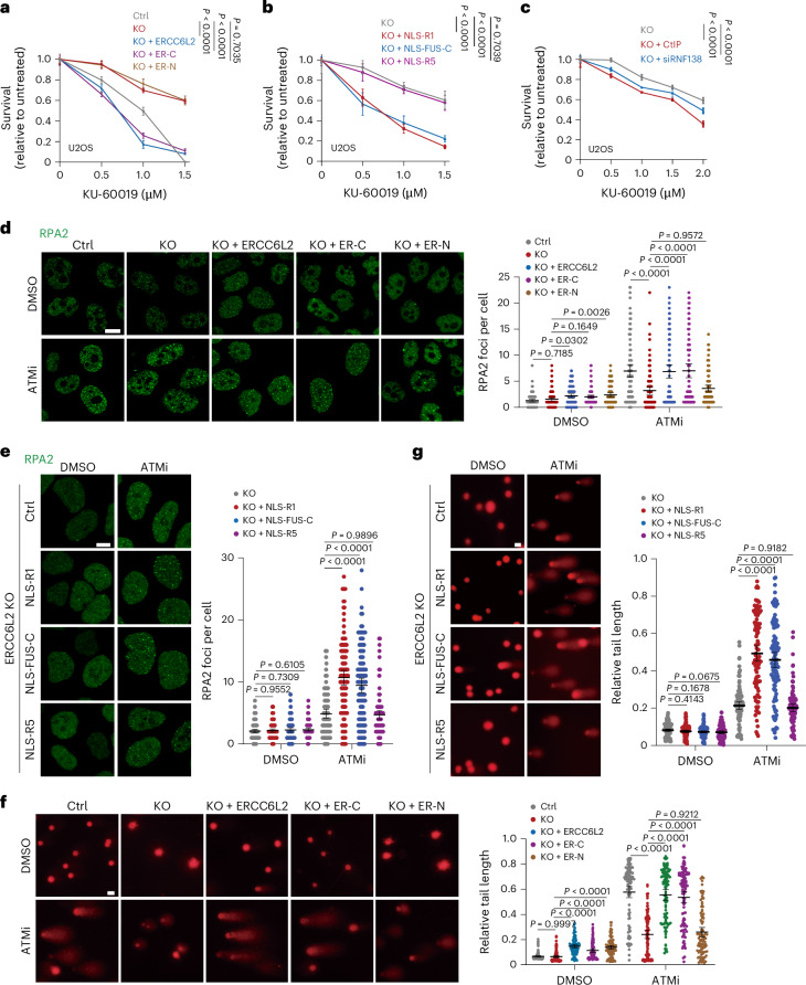 The ataxia telangiectasia mutated (ATM) kinase orchestrates the early stages of DNA double-strand break repair by promoting hyperphosphorylation of CtIP, a key step in the initiation of DNA end resection. However, the regulatory mechanisms controlling resection extent remain incompletely understood. Here we identify ERCC6L2 as a key regulator of DNA end resection in response to ATM inhibition. ERCC6L2 undergoes liquid-liquid phase separation via its intrinsically disordered regions, forming dynamic nuclear condensates that regulate CtIP stability. Disruption of these condensates renders CtIP susceptible to RNF138-mediated ubiquitination and degradation, thereby mitigating the heightened chromatin recruitment of CtIP induced by ATM inhibition. Intriguingly, ERCC6L2 is frequently downregulated in multiple cancer types and correlates with resistance to ATM inhibitors in both in vitro and in vivo settings. Our findings unveil the crucial role of ERCC6L2-CtIP condensates in governing the extent of DNA end resection and underscore the potential significance of ERCC6L2 as a predictive biomarker for ATM inhibitor response.