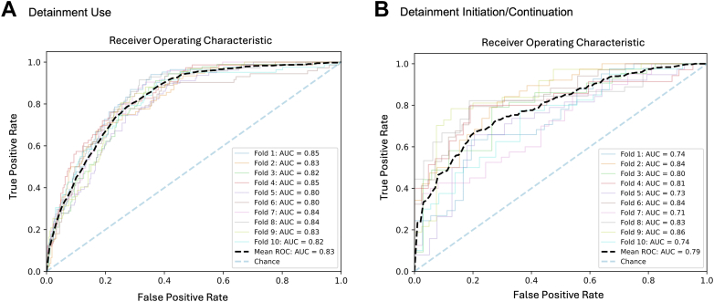 Results: Nearly 1 in 4 (n = 769, 22.4%) visits involved an involuntary detention. Half of detained children (n = 357, 46.4%) arrived on a detainment that was discontinued after MH provider evaluation. Odds of detention were greater among Black (odds ratio 1.33 [95% CI 1.02-1.73]) and publicly insured (odds ratio 1.63 [95% CI 1.37-1.94]) children. Children detained in prehospital settings resided in census tracts with greater social vulnerability scores (χ2 13.42, p < .001). Machine learning classifiers (area under the curve 0.83, [95% CI 0.81-0.84]) revealed that strongest indicators of detainment included psychiatric chief concern, prior year psychiatric hospitalization, Social Vulnerability Index, and ICD-10-CM code for suicide or self-harm.