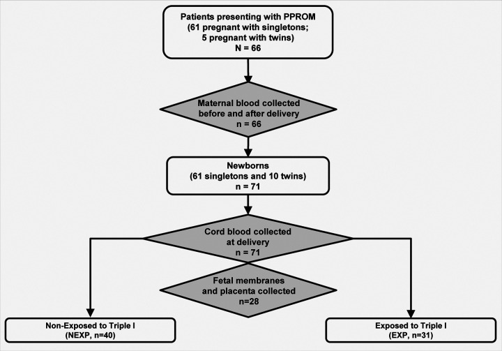 Preterm pre-labor rupture of membranes (PPROM) increases maternal and neonatal sepsis risk, yet its association with maternal microbial translocation and systemic inflammation remains unclear. We investigated whether PPROM is linked to microbial DNA in maternal blood (MB) and inflammatory responses around delivery. In 66 PPROM patients (median GA: 32±1 weeks), MB was collected pre-delivery and within 1 hour postpartum. Fetal membranes (FM) and placental tissues were sampled immediately after delivery. Bacterial load and diversity were analyzed via 16S rDNA qPCR and sequencing. Maternal cytokines were quantified by multiplex immunoassay, and fetal inflammatory exposure (Triple I) assessed using histological chorioamnionitis (HCA), cord blood haptoglobin, and IL-6. Bacterial DNA was detected in maternal blood (MB) pre- and post-delivery, with a significant postpartum decline (p=0.004). FM carried higher bacterial load and biodiversity than placenta (p<0.001), dominated by Mycoplasma spp. Maternal IL-6 and IL-10 levels rose postpartum (p<0.05), particularly in cases with fetal inflammatory exposure. Limited overlap was found between MB and tissue microbial taxa. In conclusion, bacterial DNA is detectable in maternal circulation in patients with PPROM before birth but rapidly clears postpartum alongside a robust cytokine surge, suggesting efficient clearance and dynamic inflammatory changes.
