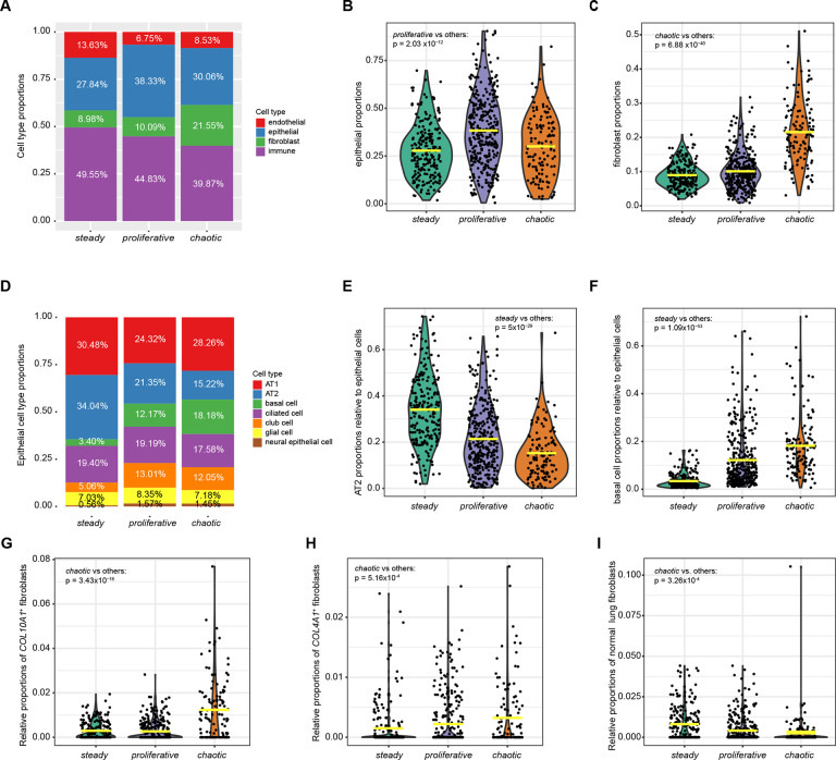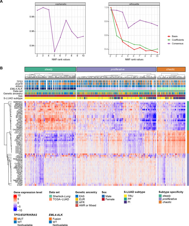 Knowledge of tumor cell dynamics can inform prognosis and treatment yet is largely lacking for lung adenocarcinoma in people who have never smoked (NS-LUAD). With RNA-seq data from 684 NS-LUAD and validation in an independent dataset, we identified three subtypes with distinct phenotypic traits and cell compositions. Additional genomic and histological data further characterized the subtypes. 'Steady', marked by low proliferation, high alveolar cell fraction, moderate-to-well differentiation, and fewer driver genes' alterations, is linked to prolonged survival and low immune evasion. 'Proliferative' shows high proliferation markers, TP53 mutations, and gene fusions. 'Chaotic', with high epithelial-to-mesenchymal transition markers, has the worst prognosis even within stage I tumors. Lacking known molecular or histological characteristics, this aggressive subtype is solely identified by transcriptomic data. A 60-gene signature recapitulates the overall classification and strongly predicts survival even within subgroups based on tumor stage or known genomic features, emphasizing its potential for improving NS-LUAD prognostication in clinical settings.