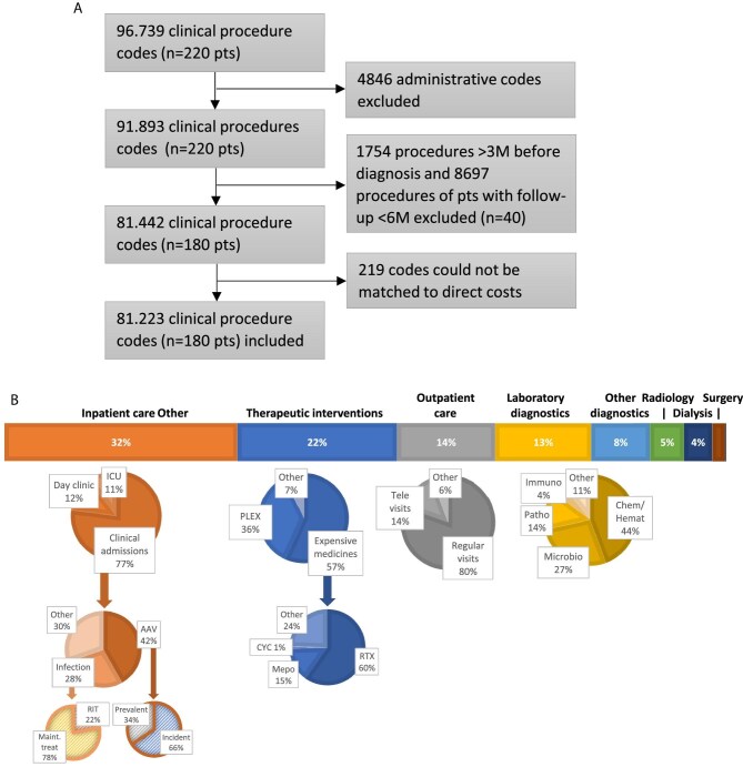 Methods: We conducted a detailed, retrospective, single-centre, activity-based cost-analysis and identified clinical variables associated with increased costs. We analysed real-world costs incurred by the hospital between January 2018 and December 2019, omitting the outpatient pharmacy expenditures. Our cohort included both incident and prevalent AAV patients with at least 6 months of follow-up since diagnosis, indicating survival beyond initial diagnosis.