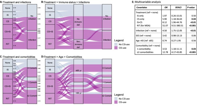 Results: For 180 AAV patients with a median follow-up of 1.8 years the average hospital costs incurred amounted to €9887 per patient year, with inpatient care being the primary cost driver (32%). Merely 15% of costs were attributable to patients experiencing relapse (N = 14/180, 8%). More importantly, 71% of costs were attributable to patients experiencing infections (N = 77/180, 43%). Likewise, 60% of costs were attributable to patients with multi-comorbidity (N = 65/180, 36%). Infections and multi-comorbidity were both strongly associated with corticosteroid (CS) use. Regression and sensitivity analyses suggest that a reduction of infections, comorbidities and maintenance treatment with CS will reduce hospital costs.