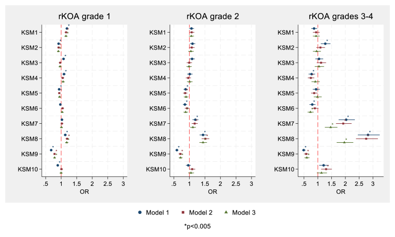 Methods: Associations between the first ten knee shape modes (KSMs), derived from statistical shape modelling, and rKOA grade were analysed using logistic regression, adjusting for age, sex, height, weight, and ethnicity. An additional model included adjustment for hip-knee-ankle (HKA) angle, derived from total body DXA scans, to reflect knee alignment. Composite figures illustrate knee shape characteristics associated with each rKOA grade.