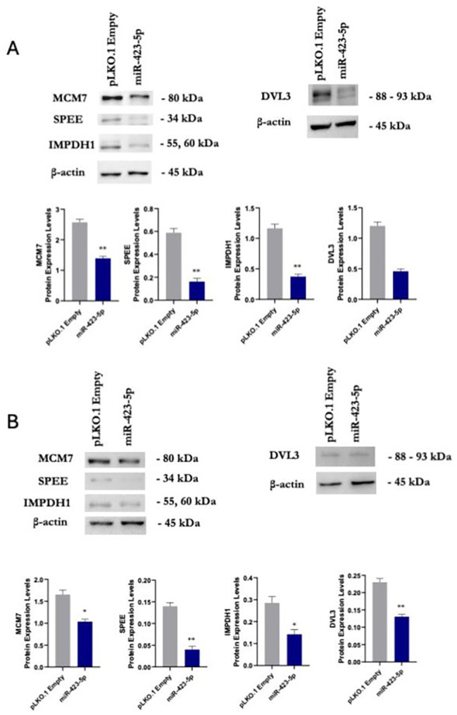 Results: Proteomic profiling identified 698 DEPs in miR-423-5p-overexpressing cells compared to controls with significant enrichment in metabolic pathways, related to purine/pyrimidine metabolism and gluconeogenesis. Integration with bioinformatic predictions and miRTarBase validation identified 43 DEPs as potential direct targets of miR-423-5p. Among these, seven proteins (ACACA, ANKRD52, DVL3, MCM5, MCM7, RRM2, SPNS1, and SRM) were significantly associated with patient prognosis in the TCGA-LIHC cohort. These targets were downregulated in miR-423-5p-overexpressing cells but upregulated in advanced-stage HCC tissues, suggesting a potential role for miR-423-5p in the regulation of HCC pathogenesis. Stage-specific expression analysis showed increased levels from stage I to III, followed by a decline at stage IV. Notably, we experimentally confirmed miR-423-5p-mediated suppression of MCM7, DVL3, IMPDH1, and SRM (SPEE), supporting their functional involvement in HCC progression.
