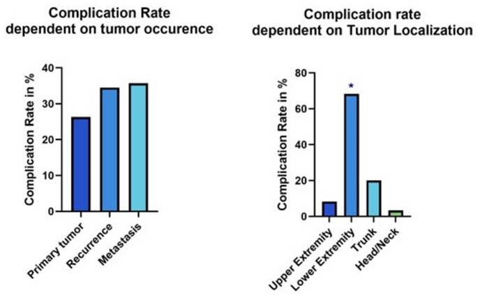Results: A total of 211 patients were examined. The most common histological subtype was liposarcoma (32,88%), followed by undifferentiated sarcoma (19,18%). Wound complications occurred in 30,19% of all cases. The analysis showed that 40,4% of patients with primary wound closure developed a complication, while only 20% of patients with NWPT did. A significant risk factor for the development of a WC was a tumor diameter > 10 cm, which led to a 20,13% higher risk of infection compared to smaller tumors. 68.3% of wound complications occurred in the lower extremity. Additionally, neoadjuvant therapy, longer operation time and immunosuppression were detected as risk factors for a higher complication rate.
