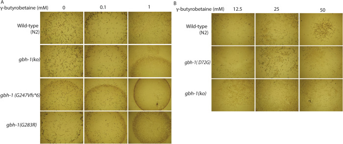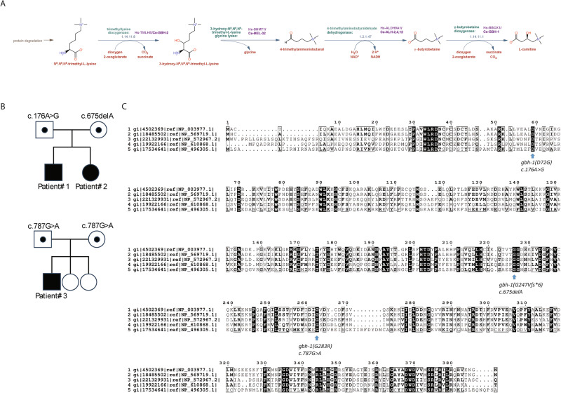 Gamma-butyrobetaine hydroxylase (BBOX1) catalyses the last step of carnitine biosynthesis, converting γ-butyrobetaine (γ-BB) into L-carnitine. Here we show, for the first time, that biallelic variants in BBOX1 are associated with decreased levels of L-carnitine and increased plasma levels of γ-BB in three patients from two unrelated families presenting with myopathic, neurodevelopmental, and late-onset psychiatric manifestations. Using a knockout C. elegans model of BBOX1 homolog, gbh-1, and strains harboring patient-derived variants (gbh-1(D72G) for p.Asp59Gly, gbh-1(G283R) for p.Gly263Arg, and gbh-1(G247Vfs6) for p.Gly227Valfs*6), we show very low L-carnitine levels and significantly elevated γ-BB in c.675delA and c.787G>A mutants, and moderately elevated γ-BB in c.176A>G. Furthermore, we observed a lethal embryonic phenotype for the gbh-1 loss-of-function strains, which was rescued upon L-carnitine supplementation. Our study provides novel insights into the clinical and biochemical consequences of BBOX1-related L-carnitine biosynthesis deficiency and establishes C. elegans as a model to study the effects of BBOX1 deficiency.