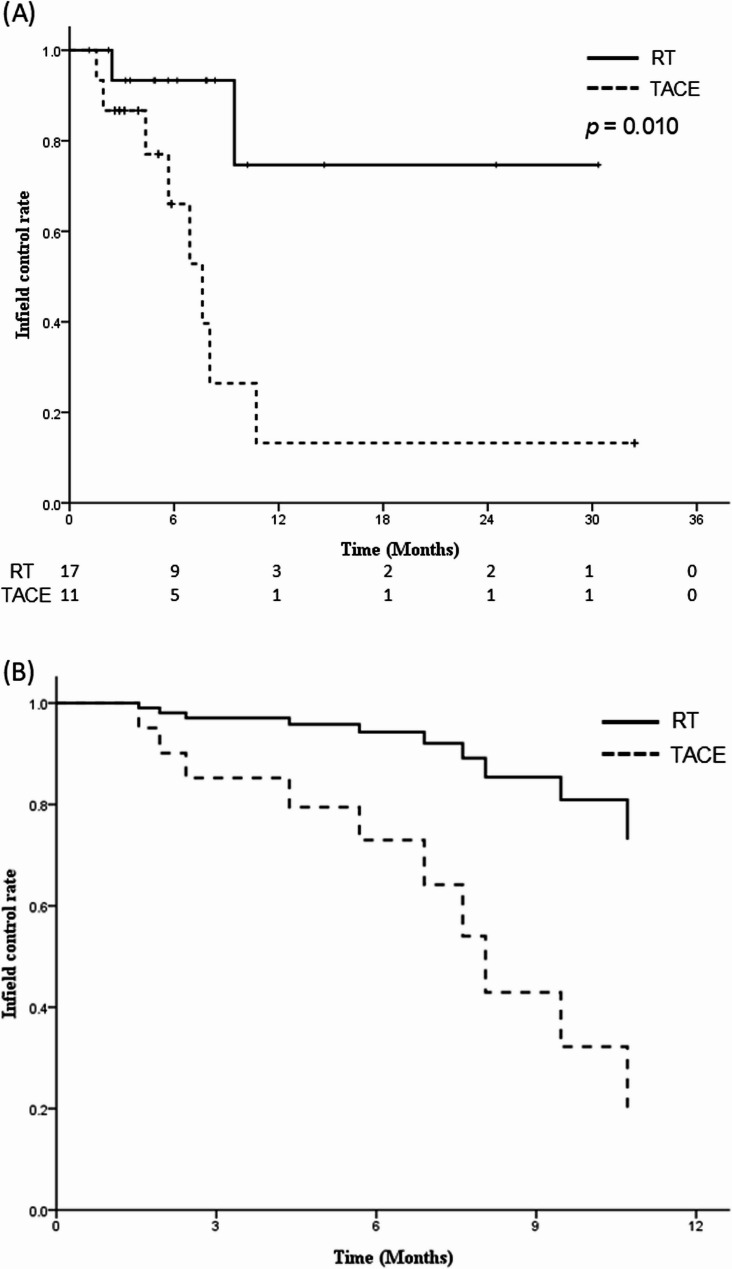 Results: With a median follow-up of 10.2 months, no significant difference in OS was observed between the RT and TACE groups. However, the Kaplan-Meier analysis indicated significantly longer IFC durations in the RT group (p = 0.010), with a 1-year IFC rate of 74.7% compared to 13.2% in the TACE group. Multivariable analysis further demonstrated that the RT group was associated with better IFC outcomes (p = 0.023). After IPTW adjustment, the RT group retained a significant IFC benefit (p = 0.020). At 12 months, the cumulative infield failure rate was 61.0% in the TACE group versus 14.9% in the RT group (p = 0.015). Alpha-fetoprotein levels significantly declined within 3 months after RT (p = 0.002) but not after TACE (p = 0.510). A ≥ 2-point deterioration in the Child-Pugh score was observed in 5.9% of the RT group when compared to 26.7% of the TACE group (p = 0.161).