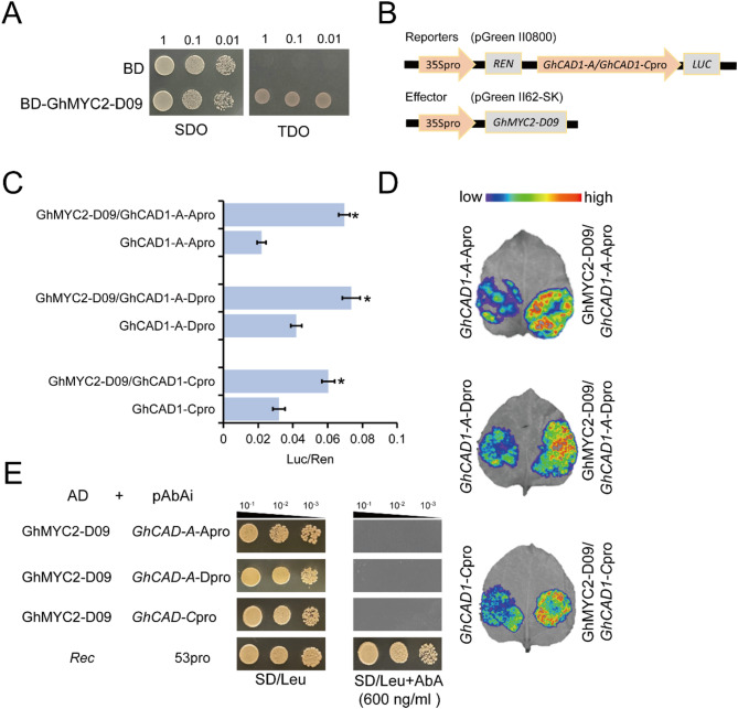 Cottonseed is the most important byproduct of cotton production. However, high free gossypol contents limit the application of cottonseed in the food or feed industry. In this study, CRISPR/Cas9 technology was used to knock out the (+)-δ-cadinene synthase gene (GhCAD) to decrease the gossypol content. Gossypol levels decreased approximately 64% in cottonseeds and leaves following the targeted mutation of GhCAD. If only GhCAD1-A was edited, the seed gossypol content decreased by approximately 46%, but there were no major changes in the leaf gossypol content. In addition, the protein and fatty acid (C16:0, C18:1, and C18:2) profiles of the transgenic cotton seeds were similar to those of the control cotton seeds. Furthermore, transcriptome analysis revealed that the jasmonic acid signal transduction pathway was significantly enriched among the DEGs, and GhMYC2-D09 expression was down-regulated. Silencing of GhMYC2-D09 via virus-induced gene silencing decreased the expression of gossypol biosynthesis-related genes, ultimately restricting the accumulation of gossypol in cotton leaves. In contrast, the overexpression of GhMYC2-D09 in hairy roots had the opposite effect. Dual-luciferase assays revealed that GhMYC2-D09 can activate the expression of GhCAD1-A and GhCAD1-C, but Y1H assays revealed that GhMYC2-D09 cannot bind directly to GhCAD promoters. In conclusion, we used CRISPR/Cas9 technology to silence GhCAD expression and developed new genetic resources for generating low-gossypol cotton materials. Furthermore, we characterized GhMYC2-D09 as a transcription factor that increases gossypol biosynthesis. These findings may provide new insights to further elucidate the regulatory network of gossypol biosynthesis.