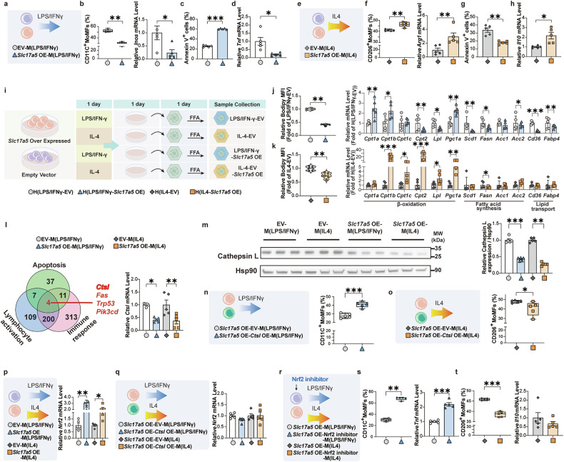 NaNO3 modulates MoMFs inflammatory responses and survival in vivo. a‒m In the first 12 weeks, two groups of C57BL/6 mice were fed with a western diet (WD), and the others were fed with a normal control diet (NCD). The mice subsequently received drinking water supplemented with 4 mM NaNO3 (Nit) or normal drinking water for another 12 weeks while the diet remained. Then the plasma and livers were collected (see Fig. 2c). a Schematic overview of the experiments for the analysis of liver cells in the NCD and WD groups. b Proportions of hepatic bone marrow monocyte-derived macrophages (MoMFs), Kupffer cells (KCs), natural killer cells (NKs), NK T cells (NKTs), and CD4+ and CD8+ T cells of NCD and WD groups were assessed via flow cytometry plus a graph (one-way ANOVA with a post hoc test for MoMFs, and NKTs, the Kruskal‒Wallis test for KCs, NKs, and CD4+ and CD8+ T cells, *P < 0.05, ***P < 0.001, n = 11, biological replicates). c Absolute cell numbers of hepatic MoMFs, KCs, NKs, NKTs, and CD4+ and CD8+ T cells of NCD and WD groups were determined via flow cytometry (one-way ANOVA with a post hoc test for NKTs, the Kruskal‒Wallis test for MoMFs, KCs, NKs, and CD4+ and CD8+ T cells, *P < 0.05, ***P < 0.001, n = 11, biological replicates). d Proportions of hepatic CD11C+ MoMFs and CD206+ MoMFs of NCD and WD groups (Kruskal‒Wallis test, *P < 0.05, **P < 0.01, n = 11, biological replicates). e Absolute cell numbers of hepatic CD11C+ MoMFs and CD206+ MoMFs (Kruskal‒Wallis test for CD206+ MoMFs, one-way ANOVA with a post hoc test for CD11C+ MoMFs, ***P < 0.001, n = 11, biological replicates). f Apoptosis (annexin V+ cells) of hepatic MoMFs of NCD and WD groups (one-way ANOVA with a post hoc test, **P < 0.01, n = 11, biological replicates). g Proportion of hepatic TNF-α+ CD11C+ MoMFs of NCD and WD groups (Kruskal‒Wallis test, **P < 0.01, ***P < 0.001, n = 11, biological replicates). h Schematic overview of the experiment for the analysis of gonadal adipose cells in the NCD- and WD-fed mice. i Proportions of MoMFs in gonadal adipose tissue (GAT) of the NCD and WD groups (Kruskal‒Wallis test, *P < 0.05, **P < 0.01, n = 11, biological replicates). j Absolute cell numbers of MoMFs in the GAT of the NCD and WD groups (one-way ANOVA with a post hoc test, *P < 0.05, **P < 0.01, n = 11, biological replicates). k Proportions of CD11C+ MoMFs and CD206+ MoMFs in the GAT of the NCD and WD groups (Kruskal‒Wallis test, *P < 0.05, **P < 0.01, ***P < 0.001, n = 11, biological replicates). l Apoptosis (annexin V+ cells) of MoMFs in GAT of the NCD and WD groups (one-way ANOVA with a post hoc test, ***P < 0.001, n = 11, biological replicates). m Proportion of TNF-α+ CD11C+ MoMFs in the GAT of the NCD and WD groups (one-way ANOVA with a post hoc test, n = 11, biological replicates). n–u C57BL/6 mice received 4 mM NaNO3 (Nit) or normal drinking water. After 1 week, half of each group was fed with a choline-deficient high-fat diet (CDHFD), and the others were fed with a NCD for 16 weeks (see Fig. 1a). n, o Proportions of hepatic MoMFs (shown as CD11bhighF4/80int cell circles in n), KCs (shown as CD11bintF4/80high cell circles in n), NKs, NKTs, CD4+ and CD8+ T cells of NCD and CDHFD groups were assessed via flow cytometry plus graphs (Kruskal‒Wallis test for MoMFs and NKs, one-way ANOVA with a post hoc test for KCs, NKTs, and CD4+ and CD8+ T cells, *P < 0.05, **P < 0.01, n = 5, biological replicates). p Absolute cell numbers of hepatic MoMFs, KCs, NKs, NKTs, CD4+ and CD8+ T cells of NCD and CDHFD groups were assessed via flow cytometry plus a graph (Kruskal‒Wallis test for KCs, NKs, CD4+ T cells, One-way ANOVA with a post hoc test for MoMFs, NKTs, and CD8+ T cells, *P < 0.05, **P < 0.01, n = 5, biological replicates). q Representative F4/80-stained mouse liver sections plus a graph showing F4/80-positive staining in NCD and CDHFD groups. Scale bars: 100 μm (one-way ANOVA with a post hoc test, *P < 0.05, n = 5, biological replicates). r Proportions of CD11C+ MoMFs and CD206+ MoMFs in the livers of the NCD and CDHFD groups (Kruskal‒Wallis test for CD206+ MoMFs, one-way ANOVA with a post hoc test for CD11C+ MoMFs, *P < 0.05, **P < 0.01, n = 5, biological replicates). s Absolute cell numbers of hepatic CD11C+ MoMFs and CD206+ MoMFs of the NCD and CDHFD groups (Kruskal‒Wallis test, *P < 0.05, **P < 0.01, n = 5, biological replicates). Relative hepatic Inos, Il12b, Arg1, and Cd206 mRNA expression of the NCD and CDHFD groups (Kruskal‒Wallis test for Inos, Il12b, and Arg1, one-way ANOVA with a post hoc test for Cd206, *P < 0.05, **P < 0.01, n = 5, biological replicates). t Apoptosis (annexin V+ cells) of hepatic MoMFs of NCD and CDHFD groups (one-way ANOVA with a post hoc test, *P < 0.05, n = 5, biological replicates). u Proportion of hepatic TNF-α+ CD11C+ MoMFs of NCD and CDHFD groups (one-way ANOVA with a post hoc test, *P < 0.05, **P < 0.01, n = 5, biological replicates). v–z Another group of C57BL/6 mice received drinking water supplemented with 4 mM NaNO3 (Nit) or normal drinking water. After 1 week, half of each group was fed with a methionine/choline-deficient diet (MCD), and the other half was fed with a NCD for 4 weeks (see Supplementary Fig. 2c). v Proportions of hepatic MoMFs of the NCD and MCD groups (one-way ANOVA with a post hoc test, ***P < 0.001, n = 5, biological replicates). Absolute cell numbers of hepatic MoMFs of the NCD and MCD groups (one-way ANOVA with a post hoc test, **P < 0.01, ***P < 0.001, n = 5, biological replicates). w Proportions of hepatic CD11C+ MoMFs and CD206+ MoMFs of NCD and MCD groups (Kruskal‒Wallis test for CD206+ MoMFs, one-way ANOVA with a post hoc test for CD11C+ MoMFs, *P < 0.05, **P < 0.01, ***P < 0.001, n = 5, biological replicates). x Relative hepatic Inos, Il12b, Arg1, and Cd206 mRNA expression of the NCD and MCD groups (Kruskal‒Wallis test for Cd206, one-way ANOVA with a post hoc test for Inos, Il12b, and Arg1, *P < 0.05, **P < 0.01, ***P < 0.0