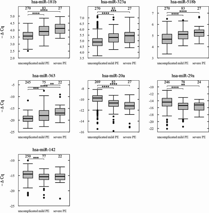 Results: Seven of the miRNAs, hsa-miR-181b-5p, -323a-3p, -518b, -363-3p, -20a-5p, -29a-3p, and - 142-3p, could differentiate between uncomplicated pregnancies and pregnancies which develop PE, but only a single miRNA, hsa-miR-363-3p, could differentiate between mild and severe PE. A combination of all seven differentiating miRNAs was the best at discriminating between PE and uncomplicated pregnancies (AUC = 0.879).