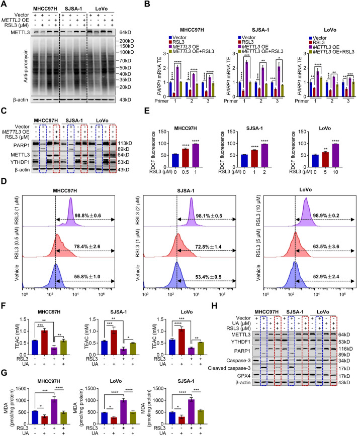 Results: RSL3 triggers two parallel apoptotic pathways via increasing reactive oxygen species (ROS) production during ferroptosis: (1) caspase-dependent PARP1 cleavage and (2) DNA damage-dependent apoptosis resulting from reduced full-length PARP1. The latter occurs through inhibition of METTL3-mediated m6A modification and subsequent suppression of PARP1 translation. Moreover, we found that RSL3 retains pro-apoptotic functions in PARPi-resistant cells and effectively inhibits PARPi-resistant xenograft tumor growth in vivo.