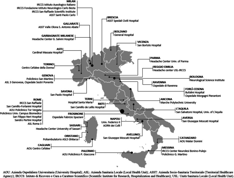 Declarations. Ethics approval and consent to participate: The protocol of the study was approved by the Ethics Committee of the coordinating center, IRCCS San Raffaele Roma (16/int, 31/7/20) and shared by the Ethics Committees of the other centers. Competing interests: Piero Barbanti received travel grants, honoraria for advisory boards, speaker panels or clinical investigation studies from Abbvie, Alder, Allergan, Amgen, Angelini, Assosalute, Bayer, Biohaven, ElectroCore, Eli-Lilly, Fondazione Ricerca e Salute, GSK, Lundbeck, Lusofarmaco, 1MED, MSD, New Penta, Noema Pharma, Novartis, Organon, Orion Pharma, Pfizer, Stx-Med, Teva, Viatris, Visufarma, Zambon and serves as President with Italian Association of Headache Sufferers. Francesca Pistoia received travel grants, honoraria for advisory boards from Allergan/Abbvie, Lilly, Lundbeck, Organon, Pfizer, Novartis, and Teva. Cinzia Aurilia received travel grants from Eli-Lilly, FB-Health, Lusofarmaco and Teva, honoraria from Novartis, Eli-Lilly and Teva. Florindo d’Onofrio received travel grant, honoraria as a speaker or for partecipating in advisory boards from Novartis, Teva, Neopharmed Gentili, Qbgroup srl, K link srl and Eli-Lilly. Gabriella Egeo received travel grants and honoraria from Eli-Lilly, Novartis, New Penta and Ecupharma. Alberto Doretti received compensation for consulting services and/or speaking activities from Abbvie, Eli Lilly, Teva, Lundbeck, Pfizer, IPSEN, Merz, Exeltis, Novartis, Zambon, Neopharmed Gentili, Piam. Bruno Colombo received travel grants honoraria for advisory boards from Lundbeck, Teva, Abbvie, Organon. Massimo Filippi is the Editor-in-Chief of the Journal of Neurology, Associate Editor of Human Brain Mapping, Neurological Sciences, and Radiology; received compensation for consulting services from Alexion, Almirall, Biogen, Horizon, Merck, Novartis, Roche, and Sanofi; speaking activities from Bayer, Biogen, Celgene, Chiesi Italia SpA, Eli Lilly, Genzyme, Horizon, Janssen, Merck-Serono, Neopharmed Gentili, Novartis, Novo Nordisk, Roche, Sanofi, Takeda, and TEVA; participation in Advisory Boards for Alexion, Biogen, Bristol-Myers Squibb, Horizon, Merck, Novartis, Roche, Sanofi, Sanofi-Aventis, Sanofi-Genzyme, and Takeda; scientific direction of educational events for Biogen, Merck, Roche, Celgene, Bristol-Myers Squibb, Lilly, Novartis, and Sanofi-Genzyme; he receives research support from Biogen Idec, Merck-Serono, Novartis, Roche, Italian Ministry of Health, Fondazione Italiana Sclerosi Multipla, and ARiSLA (Fondazione Italiana di Ricerca per la SLA). Marco Bartolini received honoraria for speaker activities from Lusofarmaco and Neopharmed. Giovanna Viticchi received honoraria for speaker activities and participating in advisory boards from Eli-Lilly, AbbVie, Teva and Boehringer Ingelheim. Renata Rao received honoraria from Abbvie, Lundbeck, Organon and Pfizer. Fabrizio Vernieri received travel grants, honoraria for advisory boards, speaker panels, or clinical investigation studies from Abbvie, Amgen, Angelini, Eli-Lilly, Lundbeck, Organon, Orion Pharma, Pfizer, Novartis, and Teva. Cinzia Finocchi received grants and honoraria from Teva, Abbvie, Organon, Orion, Pfizer, Lundbeck, Lilly. Mattia Sansone received honorarium for speaker activities from Lundbeck. Francesca Gragnani free consultant Lundbeck, Nume Plus, Summeet Srl. Paolo Solla has received speaker honoraria from Alexion, Bayer, Zambon, and Johnson and Johnson. Valentina Favoni received travel grants, honoraria for advisory boards and speaker panels from Abbvie, Eli-Lilly, Lundbeck, Pfizer and Teva. Francesca Cortese received honoraria for advisory board from Abbvie. Francesco Tazza: Orion, Abbvie, Biogen. Paola Torelli received travel grant, honoraria as a speaker, or for participating in advisory boards from Abbvie, Pfizer, Teva, Organon, Lundbeck. Sabina Cevoli received travel grants, honoraria for advisory boards, speaker panels or clinical investigation studies from Abbvie, Angelini, Biohaven, Eli-Lilly, Ipsen, Lundbeck, Novartis, Organon, Pfizer, Teva. Angelo Ranieri Honoraria for speaking activity, consulting, editorial contribution, travel grants from: Lundbeck, TEVA, Ely Lilly, Momento Medico spa, CTP spa, Vyvamed srl, CTP srl, K-link srl, AIM Education srl, Organon, Pfizer. Gennaro Alfieri for editorial contribution, travel grants from: Lundbeck, TEVA, Ely Lilly, Momento Medico spa, Pfizer. Eleonora Colombo received compensation for consulting services and/or speaking activities from Eli Lilly, Lundbeck. Fabio Frediani received honoraria as speaker or for participating in advisory boards from Novartis, Teva and Eli-Lilly. Roberta Messina received honoraria for speaker activities and participating in advisory boards from Abbvie, Biomedia, Eli Lilly, Lundbeck, Pfizer and Teva. Davide Mascarella received educational grant from Organon and travel grant from Teva. Giulia Fiorentini, Marco Aguggia, Maria Albanese, Massimo Autunno, Monica Laura Bandettini di Poggio, Laura Borrello, Stefano Bonassi, Francesco Bono, Nicoletta Brunelli, Pietro Antonio Bruno, Cecilia Camarda, Antonio Carnevale, Stefano Caproni, Sara Cazzulo, Alessandra Cherchi, Carlo Colosimo, Domenico Cosenza, Alfonso Coppola, Laura Di Clemente, Alfonsina Di Summa, Roberto De Simone, Tommaso Ercoli, Ludovica Ferrau, Annalisa Gai, Licia Grazzi, Martina Guarinoni, Rosario Grugno, Elisabetta Iannaccone, Stefano Messina, Francesco Perini, Annamaria Porreca, Stefania Proietti, Simone Quintana, Giacomo Querzola, Pietro Querzani, Steno Rinalduzzi, Micaela Robotti, Marco Russo, Gennaro Saporito, Paola Scatena, Sofia Tavani, Rossana Terlizzi, Carlo Tomino, Maurizio Zucco, Mariamichela Aquino, Vincenzo Andreone, Giulia Bozzo, Ilaria Cetta, Simone Cesarano, Alessandro Cocuzza, Vittoria Carla D'Agostino, Marcella De Luca, Arianna Deidda, Isabella Ferdinanda Pestalozza, Lorenzo Forino, Chiara Gambini, Federica Genovese, Alessandro Gotti, Gabriele Johanna Sixt, Alice Laffranchi, Riccardo Lo P