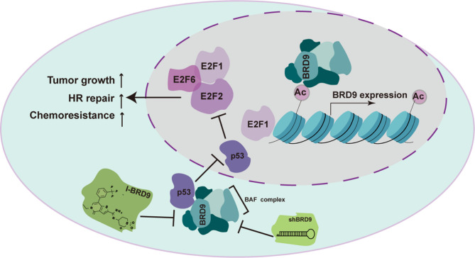 Results: BRD9 was significantly overexpressed in GC and associated with poor patient prognosis. Functionally, BRD9 promoted GC cell proliferation and enhanced DNA damage repair capacity. Mechanistically, elevated BRD9 expression inhibited p53 nuclear translocation via direct binding, subsequently activating the E2F transcription factor family. Notably, we identified that E2F1 directly bound to and transactivated the BRD9 promoter, establishing a positive feedback loop that sustains BRD9 expression. Additionally, BRD9 knockdown sensitized GC cells to cisplatin and oxaliplatin treatment.