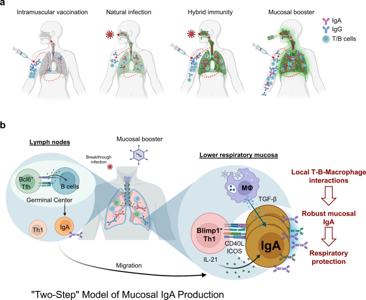 Mucosal immunization and respiratory IgA offer significant promise in protecting against airborne pathogens, including SARS-CoV-2. However, the conditions and mechanisms that lead to the robust induction of respiratory IgA responses following mucosal vaccination remain poorly understood. It is also currently debatable whether mucosal vaccination is still warranted given that most individuals in developed countries have established a hybrid immunity from vaccination and infection. Here we characterized respiratory mucosal immune responses after SARS-CoV-2 infection, vaccination or both in humans. We found that hybrid immunity resulted in moderately increased respiratory IgA and neutralizing antibody responses compared to infection or vaccination alone. However, a direct comparison of hybrid immunity and a mucosal adenovirus-based booster vaccination in animal models revealed that respiratory booster immunization elicited markedly stronger and more durable respiratory IgA, T cell response, and protective immunity against SARS-CoV-2, supporting the promise of respiratory mucosal vaccination. Mechanistically, we found that mucosal booster immunization induced local IgA-secreting cells in the respiratory mucosa, aided by pulmonary CD4+ T cells in situ. Strikingly, local IL-21-producing Blimp-1+ Th1 effector cells were critical in mediating the CD4+ T cell help for respiratory IgA production. Furthermore, lung macrophages were important for this respiratory IgA response via the production of TGF-β. Consequently, we demonstrated delivery of adenoviral booster to the lower airway was necessary to generate robust upper and lower airway IgA responses. Collectively, our results uncover a local cellular network supporting enhanced respiratory IgA responses, with implications for the development of optimal mucosal immunization strategies against SARS-CoV-2 and other respiratory pathogens.