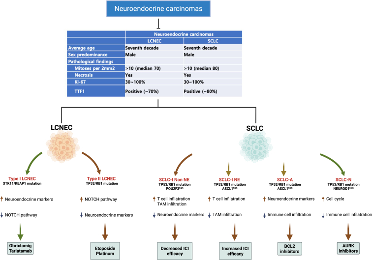 SCLC is a high-grade neuroendocrine malignancy associated with poor prognosis, comprising 15% of lung cancer cases globally. Advances in genetic profiling have revealed that SCLC is a molecularly heterogeneous disease, categorized into subtypes such as SCLC-A, SCLC-N, SCLC-P, and SCLC-I, on the basis of their neuroendocrine and immune-related characteristics. This heterogeneity underscores the need for tailored therapeutic strategies. Large cell neuroendocrine carcinoma (LCNEC) shares histologic and molecular similarities with SCLC but remains a distinct entity. LCNEC is categorized into two major subtypes: Type I, characterized by STK11 and KEAP1 mutations and a neuroendocrine phenotype, and Type II, defined by TP53 and RB1 alterations with higher proliferative indices. LCNEC's rarity and molecular diversity present challenges for standardized treatment, further highlighting the need for comparative research with SCLC. In this review, we highlight the genetic and clinicopathologic features of SCLC and LCNEC. Furthermore, we discuss emerging therapeutics and future directions in the treatment of SCLC and LCNEC.