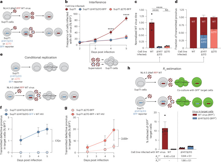 During replication of some RNA viruses, defective particles can spontaneously arise and interfere with wild-type (WT) virus replication. However, these defective interfering particles (DIPs) have not been reported in people with HIV-1 (PWH). Here we find DIPs in PWH who have a rare, polyclonal form of non-suppressible viraemia (NSV). We characterized the source of NSV in two PWH who never reached undetectable viral load despite adherence to antiretroviral therapy (ART). Remarkably, in each participant, we found a diverse set of defective viral genomes sharing the same fatal deletions. This paradoxical accumulation of mutations by viruses with fatal defects was driven by superinfection with intact viruses, resulting in mobilization of defective genomes and accumulation of additional mutations during untreated infection. These defective proviruses interfere with WT virus replication, conditionally replicate and, in one case, have an R0 > 1, enabling in vivo spread. Despite this, clinical outcomes showed no beneficial effect of these DIPs. These findings demonstrate that fatally defective proviruses, traditionally considered evolutionary dead ends, can replicate and diversify upon superinfection without preventing disease progression.