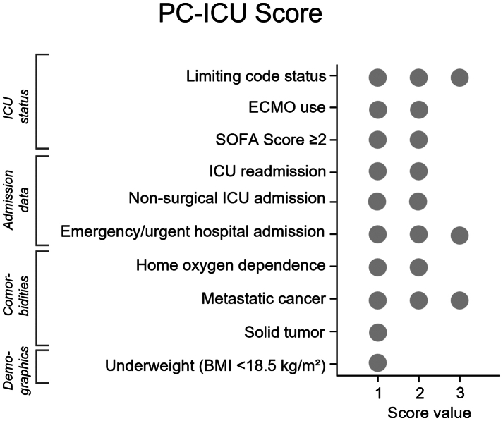 Interpretation: The PC-ICU score predicts PC consultation during intensive care upon ICU admission. This externally validated instrument can identify patients with potential PC needs and may facilitate integration of multi-disciplinary care. Additional prospective evaluation of the PC-ICU score in different national and international locations, healthcare settings and patient populations is needed to further enhance generalisability.