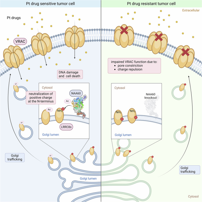 The platinum-based drugs cis- and carboplatin, which are crucial for treating cancers with DNA repair defects, like those caused by BRCA1/2 mutations, rely on the volume-regulated anion channel subunits LRRC8A and LRRC8D for about 50% of cellular drug uptake. Yet, the precise mechanisms of how LRRC8A and LRRC8D mediate this function are largely unknown. Here, we identify NAA60, an N-terminal acetyltransferase, which localizes to the Golgi apparatus to affect LRRC8A and LRRC8D function. Our data suggest that NAA60 acetylates the LRRC8A/D N-termini, and its loss decreases cis- and carboplatin uptake resulting in drug resistance of otherwise hypersensitive BRCA1;p53-deficient cells and tumors. Furthermore, we mimicked the absence of the neutralizing acetyl moiety that is observed after loss of NAA60 by introducing positively charged amino acids at the N-termini of LRRC8A/D, which indeed decreased cis- and carboplatin sensitivity. Our findings highlight the importance of N-terminal acetylation by NAA60 for effective platinum drug uptake, offering new insights into overcoming drug resistance.
