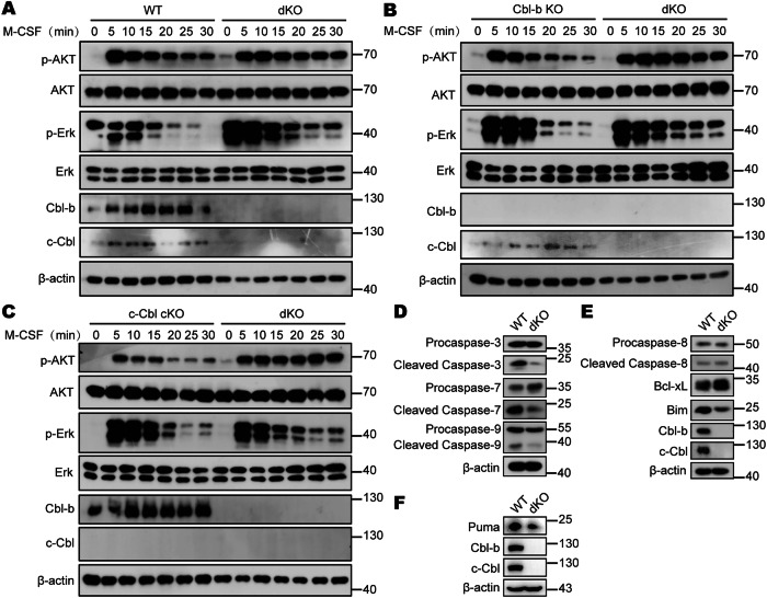 The Casitas B-lineage lymphoma (Cbl) family proteins are E3 ubiquitin ligases implicated in the regulation of various immune cells. However, their function in macrophages remains unclear. Here, we identify both Cbl-b and c-Cbl (Cbls) as inhibitors of macrophage proliferation and promoters of macrophage apoptosis. Mechanically, we identify that Cbls functions upstream of AKT and Erk to mediate the ubiquitination and degradation of M-CSFR. M-CSF stimulation promotes dimerization and autophosphorylation activation of M-CSFR on the macrophage membrane, thereby activating downstream PI3K-AKT and Erk signaling pathways, leading to different biological effects such as macrophage proliferation and survival. At the same time, the Y559 site of the M-CSFR undergoes autophosphorylation, which can promote receptor recruitment and phosphorylation of Cbls. This promotes Cbls to induce K63-linked polyubiquitination at the K791 site of M-CSFR, leading to internalization and degradation of M-CSFR through lysosomal pathways, preventing excessive activation of the signaling pathway. Furthermore, Cbls deficiency results in increased proliferation and decreased apoptosis of macrophages in vitro and in vivo and dKO mice spontaneously develop a macrophage-dominated pulmonary enlargement. Together, these data demonstrate that Cbls play critical roles in the regulation of macrophage homeostasis by inhibiting M-CSFR-mediated AKT and Erk activation.