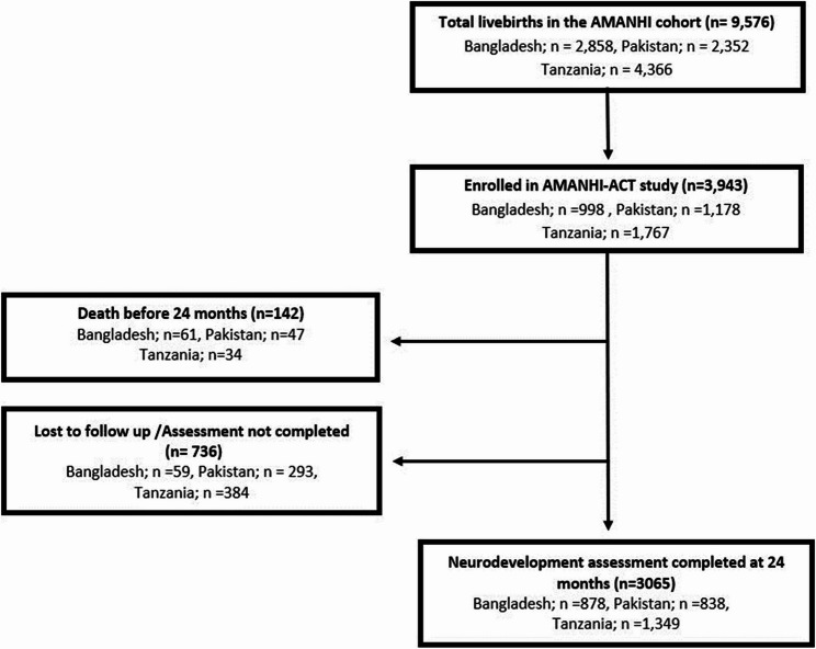 Declarations. Ethical approval and consent to participate: The AMANHI study received ethical approval from the local and institutional ethics committees of all three sites. These included Zanzibar Health Research Ethics Committee (formerly ZAMREC) (ZAMREC/0002/OCTOBER/013) for Tanzania, ICDDR, B (PR12073), and Johns Hopkins University (IRB 00004508) for Bangladesh, and Aga Khan University (2790-paeds-ERC-13) for Pakistan. In addition, the protocols for the biorepository study were also approved by the WHO Ethics Committee (RPC 532), and continuing approvals were sought yearly. Informed consent was obtained from pregnant women at the time of enrollment, and later, at childbirth, they consented to their child’s participation in the study. Consent forms were provided in the mothers’ preferred languages to ensure comprehension. In cases where mothers expressed concerns about their child’s development, or where the child showed faltered physical growth or developmental delays, referrals were made to the Outpatient Department (OPD) of the study center. Physicians at the OPD then assessed the child and, if necessary, referred them to nearby hospitals for further evaluation and management. Consent for publication: Not applicable. Competing interests: The authors declare no competing interests.